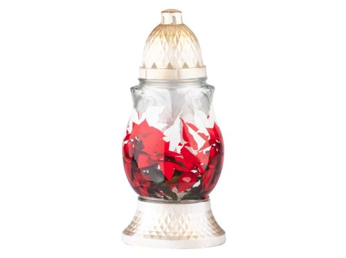 Sklo poskytuje až 24 hodin hoření. Ideální pro vánoční dekorace na hřbitově. Jeho rozměry jsou 24 cm.