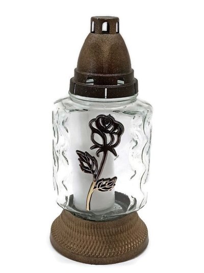 Skleněná hřbitovní svíčka s vyměnitelnou parafínovou náplní 60g, s plastovým spodkem, zajišťujícím dobrou stabilitu skla a plastovým vrškem, který chrání plamen před zhasnutím vlivem větru a deště. Rozměry 10 x 8 a výška 25 cm, možnost použít náhradní vklad 100g. Doba hoření do 16 hodin. Vyrobeno v EU. EAN
