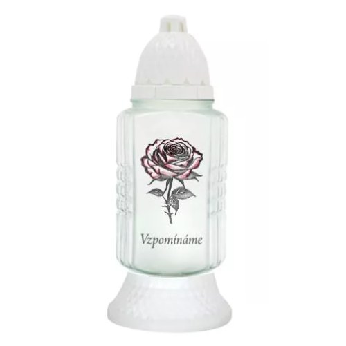 Skleněná hřbitovní svíčka s vyměnitelnou parafínovou náplní 80g, s plastovým spodkem, zajišťujícím dobrou stabilitu skla a plastovým vrškem, který chrání plamen před zhasnutím vlivem větru a deště. Rozměry 8 x 8 a výška 27 cm, možnost použít náhradní vklad 100g. Doba hoření do 24 hodin. Vyrobeno v EU. EAN