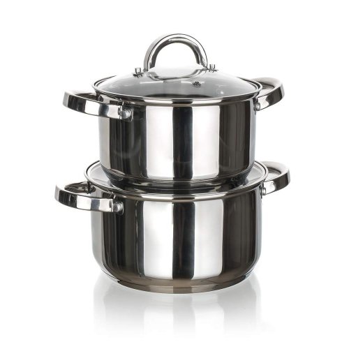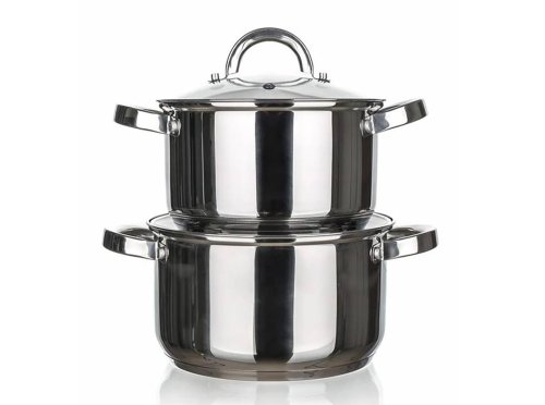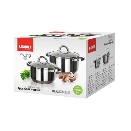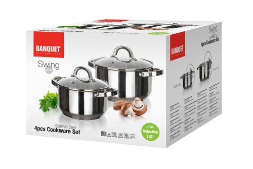 Sada nerezového nádobí SWING obsahuje dva hrnce se skleněnou poklicí. Poklice jsou vyrobeny z odolného skla a mají otvor na páru pro dokonalou kontrolu nad vařením. Povrchová uprava nerezi lesk (uvnitř i vně). Držadla jsou k hrncům našroubovaná. Nádobí lze používat na všechny typy sporáků. Nádobí se snadno udržuje, lze mýt v myčce.