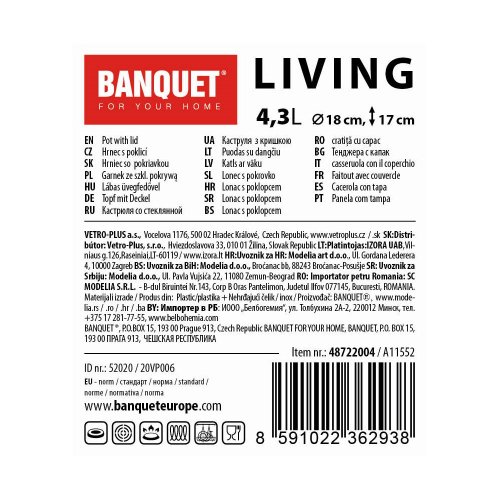 Nerezový hrnec LIVING se skleněnou poklicí, nerezovým knobem a držadly. Lesklý povrch uvnitř i vně, vnější strana má tři matné pruhy. Hrnec lze použít na všechny typy varných desek včetně indukce.