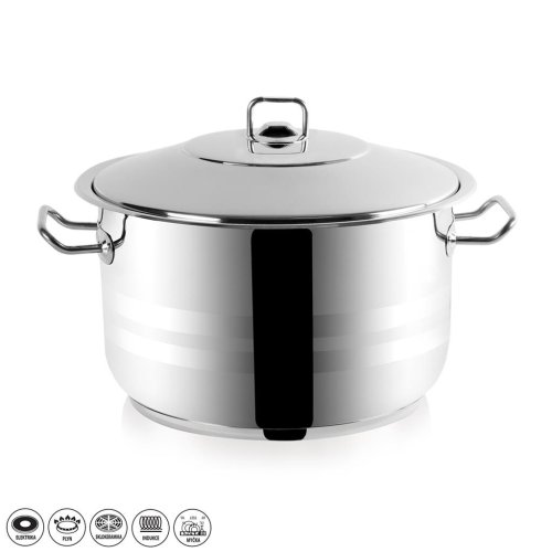 Celonerezový hrnec Gastro s pokllicí. Nerezová ocel 18/0. Průměr 40 a výška 26 cm, objem 33 litrů. Zesílené sendvičové dno. Vhodné pro všechny typy plotýnek vč. indukce. Vhodné do myčky nádobí. EAN 5999558579326