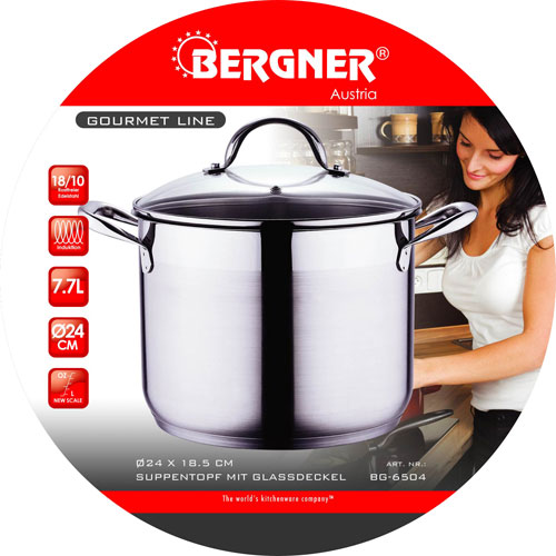 -Indukční nádobí Bergner-materiál: nerezová ocel 18/10, tloušťka 0,6 mm-stříbrná barva-celonerezové držadla-rozměry: průměr 24 x 18,5 cm, objem 7,7 L-sendvičové dno-skleněná poklice