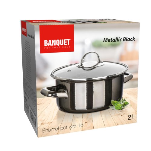 Smaltovaný hrnec METALLIC Black se skleněnou poklicí. Hrnec lze používat na všechny typy varných desek včetně indukce.