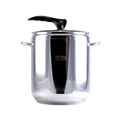 Nerezový tlakový hrnec 13 litrů s pákovým uzávěrem. Průměr 23 cm a výška 34.5 cm. Silné sendvičové dno. Víko obsahuje dva ventily, hlavní pracovní ventil a pomocný / bezpečnostní ventil. Tlakový hrnec je určen pro rychlou přípravu pokrmů a lze jej používat na všechny typy varných desek vč.indukce. Hrnec je vhodný do myčky nádobí a na indukční desky. EAN 5999541201418