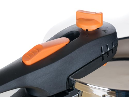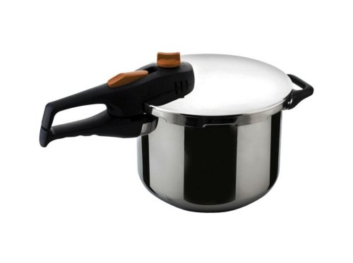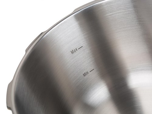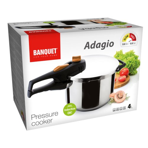 Nerezový tlakový hrnec ADAGIO s bajonetovým uzávěrem. Velmi pevná konstrukce (dno 5 mm, stěna 1 mm), nerez 18/8. Poklice obsahuje pracovní ventil, pojistku proti otevření natlakovaného hrnce a silikonové těsnění. Pracovní tlak 0,6 nebo 0,9 bar. Hrnec má silné sendvičové dno a je vhodný na všechny typy varných desek vč. indukce.