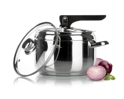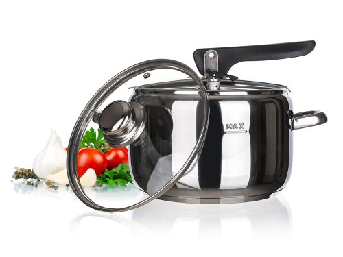 objem: 5 l průměr: 20,8 cm výška: 15 cm materiál: nerez 18/0 tloušťka stěny: 0,6 mm silné sendvičové dno 2 ventily skleněná poklice