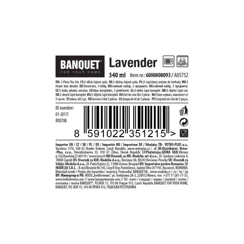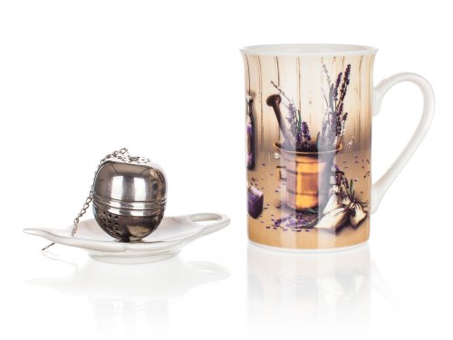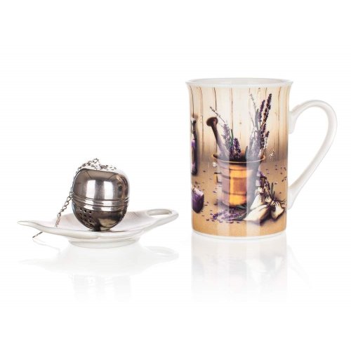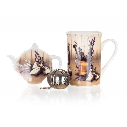 čajová sada LAVENDER obsahuje: 1 x keramický hrnek o objemu 340 ml, výška 10,8 cm, průměr 7,6 cm 1 x nerezové sítko 1 x tácek pod sítko