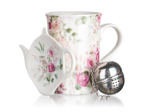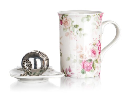 Čajová sada ROSE obsahuje kkeramický hrnek, nerezové sítko a keramický tácek pod sítko