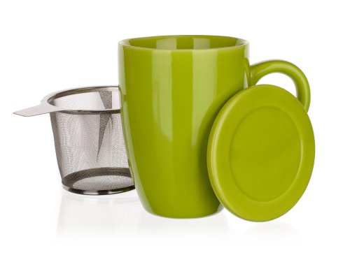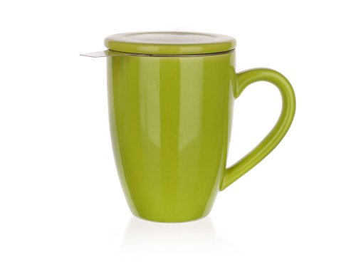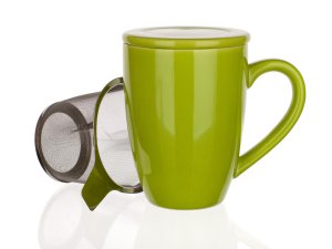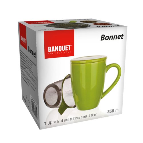 Hrnek s víčkem 350 ml BONNET, zelená glazura, materiál - keramika, nerezové sítko na louhování čaje. Rozměry hrnku: výška 12 cm, průměr 8,5 cm. Hrnek i víčko lze používat do mikrovlnné trouby a mýt v myčce na nádobí. Hrnek s víčkem 350 ml BONNET.