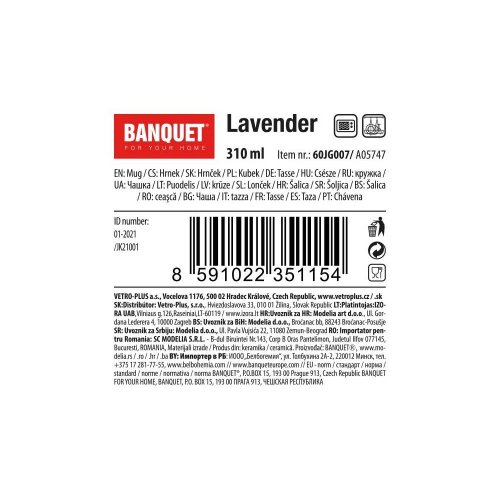 Sada hrnků LAVENDER. V sadě jsou vždy 2 stejné bílé hrnky s dekorem LAVENDER na obou dvou stranách. Hrnky lze používat do mikrovlnné trouby a mýt v myčce na nádobí (při běžném domácím užití).
