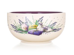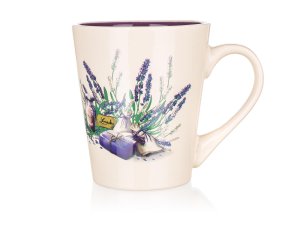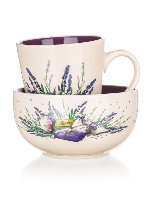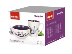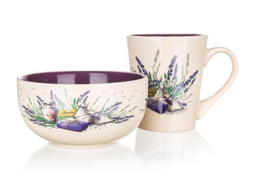 2dílná snídaňová sada LAVENDER, sada obsahuje: 1x keramický hrnek o objemu 360 ml a 1x keramickou misku o objemu 540 ml, dvoubarevná glazura s dekorem levandule.