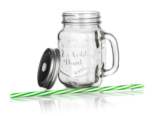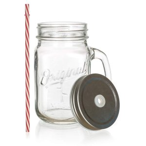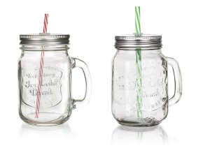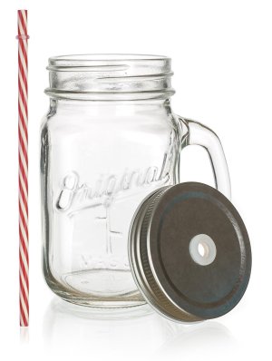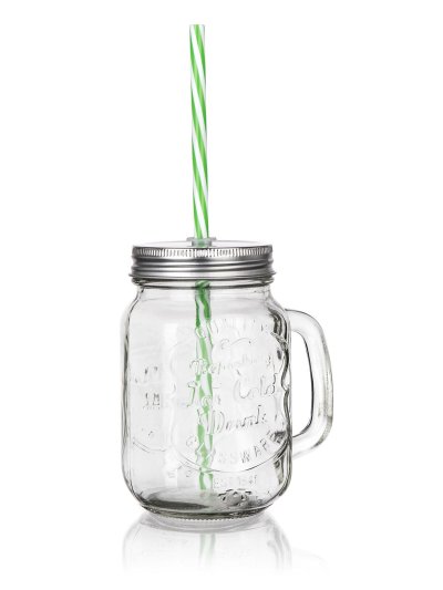 Skleněný hrnek s uchem je opatřený praktickým šroubovacím plechovým víčkem stříbrné barvy a brčkem. Hrnek je ideální na limonádu, ledové čaje a koktejly. Skvěle se hodí na zahradní slavnost, letní párty či svatbu.