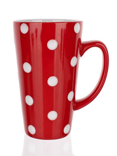 Vysoký červený hrnek s puntíky. Hrnek lze používat do mikrovlnné trouby a mýt v myčce na nádobí.