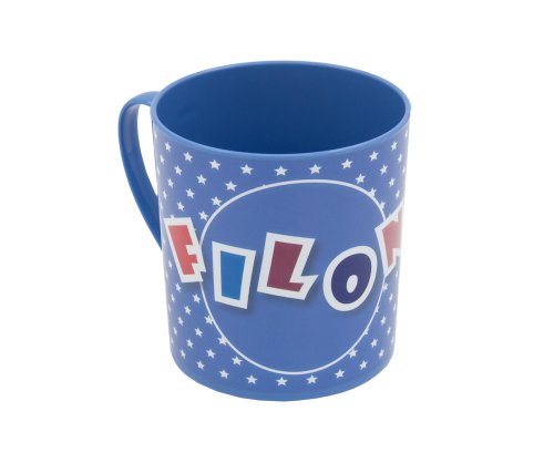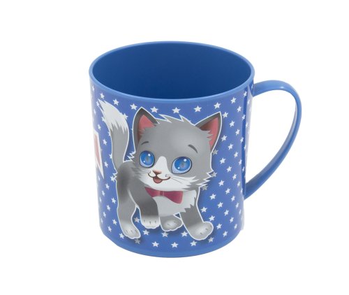 Plastový hrnek s dětským motivem je lehký a dobře padne dětem do ruky.