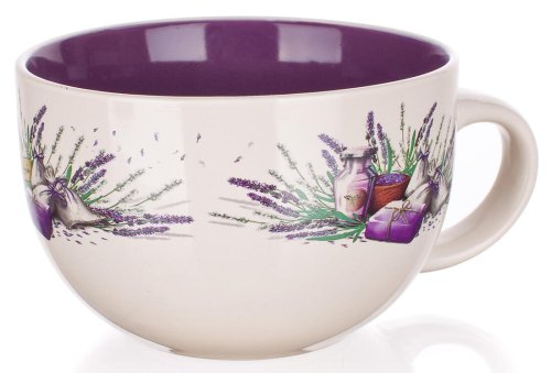 Hrnek jumbo LAVENDER, dvoubarevná glazura s dekorem levandule. Hrnek lze používat do mikrovlnné trouby a mýt v myčce na nádobí (při běžném domácím užití).