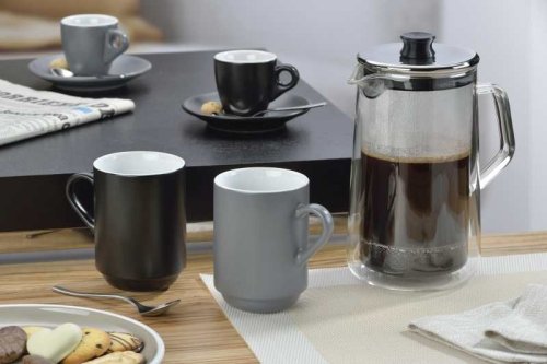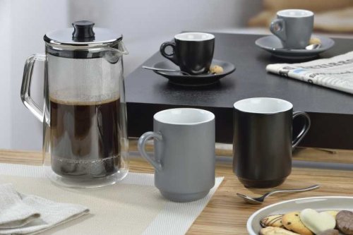 Dáte si šálek kávy nebo čaje? Dvoudílná sada keramických hrnků s názvem Mattia. Košíčky jsou k dispozici ve dvoudílné sadě v různých barvách a mají matný vzhled. Barevná varianta šedá, 7,5 cm keramika, 11 cm v, 7,5 cm sada 2 ks, 300 ml