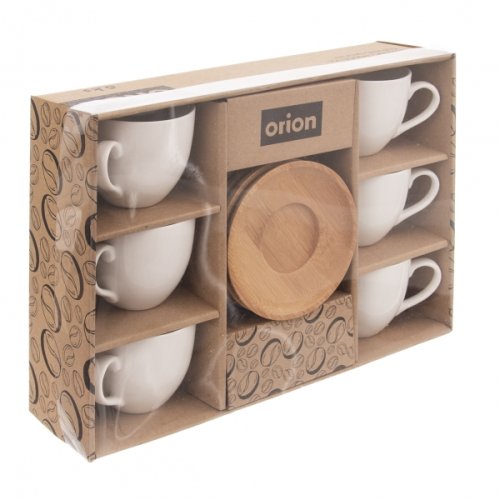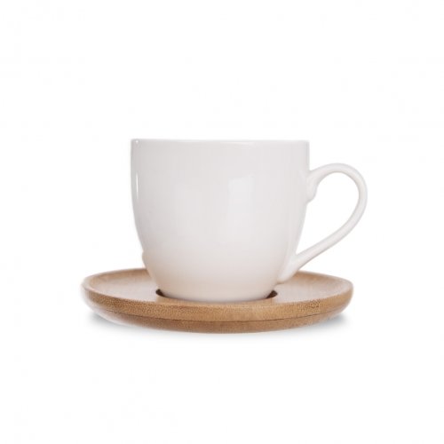 Sada hrnek s uchem a podšálek. Materiál porcelán, bambusové dřevo. Barva bílá. Objem 0.14 litru, průměr šálku 6.5 cm, výška 6 cm, průměr podšálku 9.5 cm. EAN 8592381161743