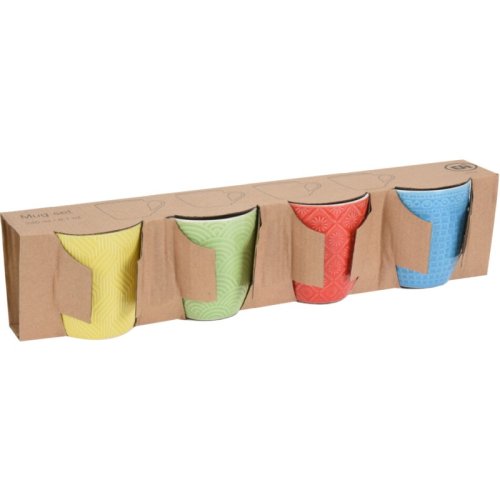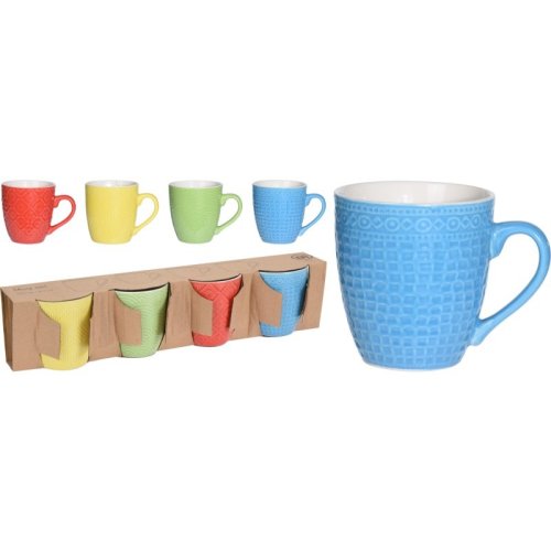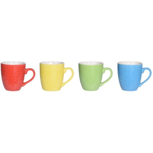 hrnek porcelán 240ml/ 8,12 oz, sada 4ks. velikost na kus průměr 75xh70mm. ve 4 různých barvách na sadu, zelená, žlutá, modrá a červená.