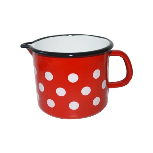 Smaltovaný hrnek s výlevkou Materiál: kov, smalt Barva: červená, bílé tečky Výška: 11 cm Průměr: 12cm Objem: 1,2 l Vhodné do myčky na nádobí.