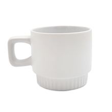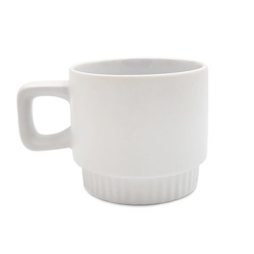 Matný keramický hrnek s vroubkovaným dnem a hranatým ouškem Vnější strana je opatřena polyesterovou vrstvou Vhodný pro sublimační potisk Výška 82 mm, průměr 91 mm Objem 300 ml Barva bílá