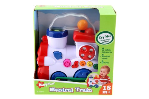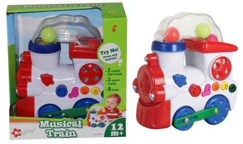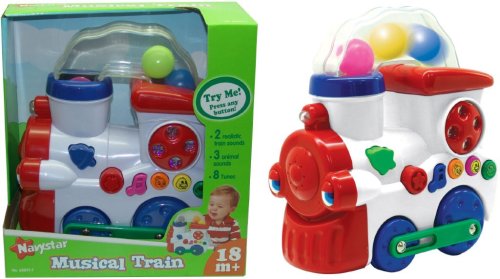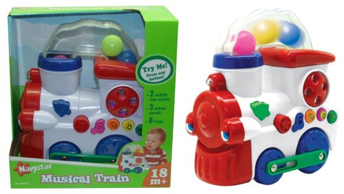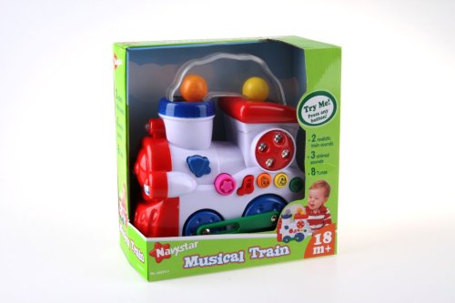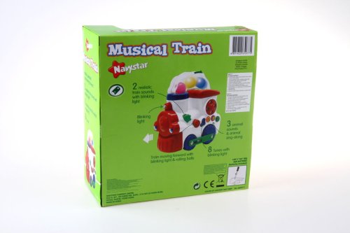 Hudební hračka podporující radost ze hry u vašeho dítěte. Vyrobeno z kvalitního plastu. Zabaví každé zvídavé dítě. Po stisku tlačítka ve tvaru hvězdičky mašinka jede a komínem létají balonky. Mašinka vydává zvuky jako skutečný vlak, umí zahrát osm melodií a vydávat tři různé zvířecí zvuky.