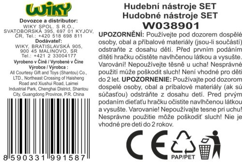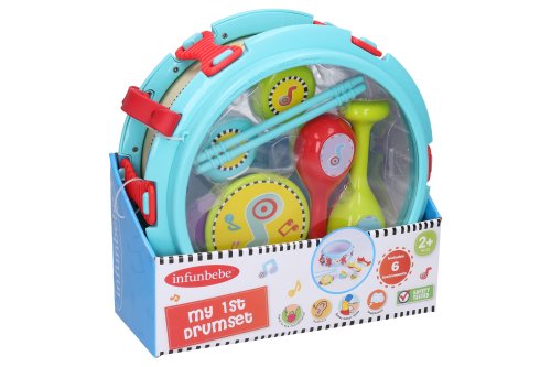 Hudební nástroje sada. Obsahuje buben, rumba koule, kastaněty, tamburínu, paličky na bubnování. Velikost bubnu 27cm.