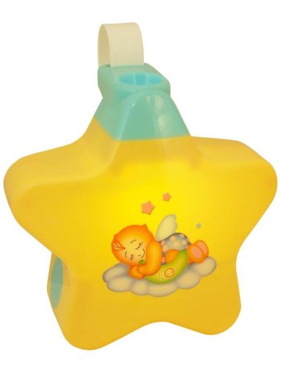 Hudební projektor pro miminka. Projektor ve tvaru hvězdičky promítá na strop krásné obrázky hvězdiček a medvídka a hraje 3 ukolébavky. Na hvězdičce je tlačítko pro vypnutí a zapnutí ON/OFF. Poloha tlačítka ON má dvě možnosti, které určují hlasitost melodií. Projektor má samostatné tlačítko, kterým se zapíná hudba a samostatné tlačítko, kterým se zapínají pohyblivé obrázky. Vyrobeno z kvalitního plastu. Určeno pro děti od narození. Baterie jsou součástí balení. Rozměry cca 15x15 cm.