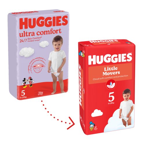 Plenky HUGGIES® Little Movers – nyní ještě jemnější a měkčí – zajistí pohodlí a extra ochranu při objevování nového vzrušujícího světa.