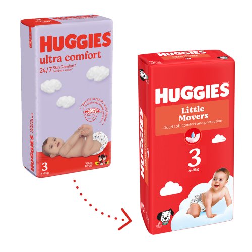 Plenky HUGGIES® Little Movers – nyní ještě jemnější a měkčí – zajistí pohodlí a extra ochranu při objevování nového vzrušujícího světa.