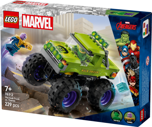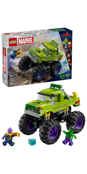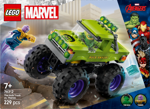 Stavebnice LEGO® Marvel Hulkův truck vs. Thanos pro kluky a holky od 7 let dětem přináší akční superhrdinské vozidlo Stavebnice obsahuje minifigurku Hulka s odnímatelnou helmou a minifigurku Thanose s teseraktem a Rukavicí nekonečna Robustní superhrdinský truck má sedadlo řidiče s prostorem pro minifigurku Hulka a velká otáčecí kola s odpružením Vnější strana zeleného trucku je zdobená ve stylu Hulka a doplňuje ho nápis „Hulk Smash!" a obličej Hulka