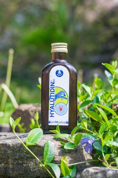 Hyalutidin DC Aktiv - Tonikum s Hyaluron-Chondroitin-Komplexem. Kloubní výživa pro psy a kočky - aktivní síla pro zdravý pohybový aparát všech plemen psů a koček - k pohodě i stabilním maximálním výkonům. Složení: Ve 100 ml: roztok farmaceuticky čisté vody s Hyaluron - Chondroitin - Komplexem (HCK) 2 500 mg, invertní cukr 45 g. Přídavné látky: vitamin E 50 mg, konzervant sorbát draselný (E202). Energetická hodnota ve 100 ml: 820kJ/195kcal. Doporučené dávkování: