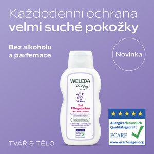 Toto přírodní tělové mléko poskytuje pokožce 3v1 účinek: okamžitě ji hydratuje, zklidňuje a dlouhodobě posiluje její ochrannou bariéru. Bylo vyvinuto ve spolupráci s porodními asistentkami a dermatology speciálně pro potřeby dětí se suchou, citlivou až atopickou pokožkou – a je vhodné už od narození. Lehká textura se snadno roztírá a rychle vstřebává bez lepivého pocitu. Jemné složení bez parfemace a alkoholu kombinuje účinné bioaktivní látky: výtažek z bílého slézu zklidňuje podráždění a přispívá k hloubkové hydrataci, zatímco rostlinné oleje z pupalky, konopí, mandlí a sezamu dodávají pokožce potřebné lipidy a omega-3 a 6 mastné kyseliny, které posilují její přirozenou ochrannou funkci. Prebiotické oligosacharidy z kořene mondo grass navíc podporují rovnováhu kožního mikrobiomu – klíčového faktoru zdravé a odolné pokožky. Účinnost byla potvrzena in-use studií na 30 osobách s citlivou pokožkou (Weleda, 2025). Při aplikaci 2× denně po dobu 4 týdnů došlo k prokazatelnému zklidnění, zmírnění diskomfortu, posílení hydratace a zlepšení stavu kožní bariéry. Dermatologicky testováno, vhodné i pro velmi citlivou pokožku se sklonem k atopii. Certifikace a etické standardy: NATRUE – skutečně přírodní kosmetikaB Corp – etické a udržitelné podnikáníVEGAN – bez složek živočišného původuECARF – vhodné i pro alergiky