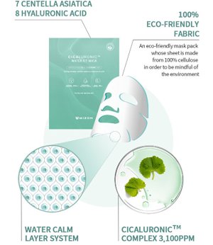 Hydratační pleťová maska s 94 % přírodních látek je vyrobená ze 100 % ekologické celulózy. Maska dodává pleti potřebnou hydrataci a zanechá ji jemnou a hebkou. Obsahuje patentovaný komplex CICALURONIC TM, který obsahuje 3 100 ppm extraktu centella asiatica a 1 000 ppm osmi druhů kyseliny hyaluronové. Účinně zadržuje vlhkost v pokožce a brání přirozeně jejímu vysušování. Maska je vyrobena z vysoce kvalitního přírodního materialu, který dokonale přilne k pokožce a zajistí tak rychlé absorbování všech aktivních složek.