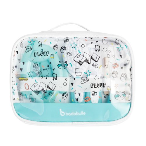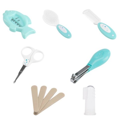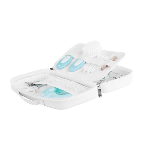 Hygienický set obsahující: 1 hřebínek, 1 kartáč na vlásky, 1 zaoblené nůžky, 4 pilníčky, 1 kleštičky na nehty, 1 silikonový kartáček na masírování dásní a 1 teploměr do vody.