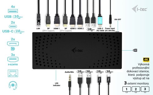 Port HDMI 3 funguje pouze v případě, že je dokovací stanice připojena k portu Thunderbolt nebo USB-C (podporujícímu režim DisplayPort Alt).