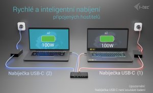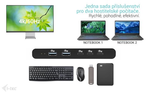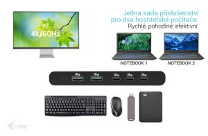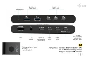 Dokovací stanice I-TEC USB-C KVM Dock představuje ideální řešení rovnou pro dva hostitele. Podporuje plynulé přepínání mezi PC1 a PC2, což znamená, že vám stačí jedna dokovací stanice pro provoz periferních zařízení na dvou počítačích. Stačí mezi nimi jen přepínat pomocí tlačítka. Dvojité výkonné napájení Power Delivery (2× 100 W), takže oba systémy lze nabíjet současně. Samozřejmostí je integrovaný KVM přepínač.
