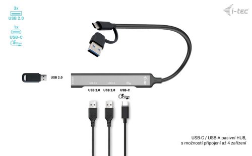 S tímto hubem získáte další port USB-C a tři USB 2.0 porty. Připojte si externí klávesnici a myš, přenášejte data nebo filmy z USB flash disku rychlostí až 5 Gbps nebo nabíjejte svá mobilní zařízení. Hub nevyžaduje instalaci ovladačů, pouze jej pomocí USB-C kabelu nebo pomocí vestavěné USB-A redukce připojíte a můžete jej ihned začít využívat. Samozřejmostí je kompatibilita s portem Thunderbolt 3/4. Kovové tělo nabízí maximální odolnost a ochranu.