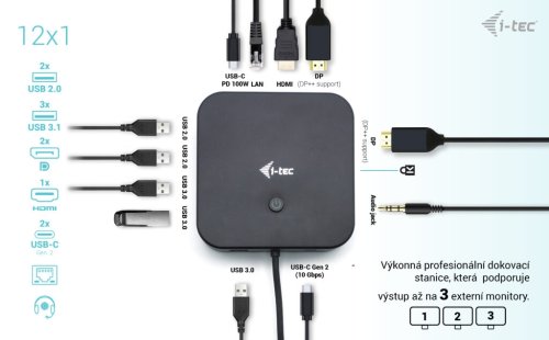 • Připojte až tři externí monitory 4K/30Hz • Obnovovací frekvence až 360 Hz (při připojení k jednomu monitoru v rozlišení 1080p) • Power delivery: až 100 W • 1x HDMI, 2x DisplayPort++ • 3x USB 3.1, 1x USB-C 3.2 Gen2 (10 Gbps) a 2x USB 2.0 vám umožní snadné připojení vašich USB zařízení a periferií. Gigabitový Ethernet RJ-45 poskytuje spolehlivé, robustní a vysokorychlostní internetové připojení s podporou 10/100/1000 Mbps rychlostí • Kombinovaný jack pro audio a mikrofon na předním panelu • Zámek Kensington zajistí ochranu proti zcizení, zejména v prostředí sdílených kanceláří či veřejně přístupných míst • Vypínač dokovací stanice umožní maximální úsporu elektrické energie • Dokovací stanice podporuje držák VESA pro inteligentní vertikální instalaci za monitor s VESA podporou • Podporuje Windows 10, macOS, Android, iPadOS, ChromeOS a Linux