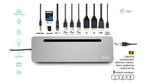 • 1x port USB-C PD (pouze napájení) • 4x port USB-A 3.2 Gen. 1 (5 Gb/s) • 1x port Ethernet GLAN RJ-45 • 1x slot SD / microSD • 1x 3,5 mm kombinovaný audio port • Klonování adres MAC: Ano (pomocí softwaru i-tec Docker Pro)