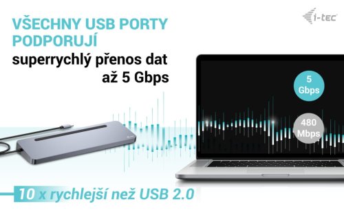 • 1x port USB-C PD (pouze napájení) • 4x port USB-A 3.2 Gen. 1 (5 Gb/s) • 1x port Ethernet GLAN RJ-45 • 1x slot SD / microSD • 1x 3,5 mm kombinovaný audio port • Klonování adres MAC: Ano (pomocí softwaru i-tec Docker Pro)