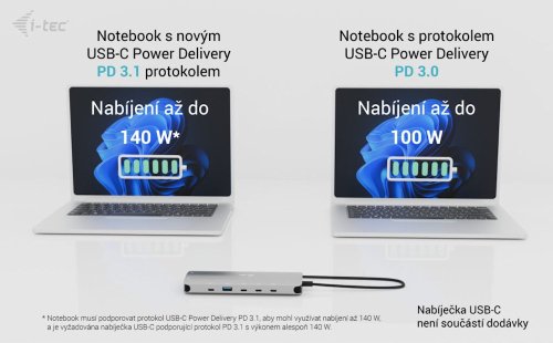 Pokud váš notebook nebo tablet podporuje nový a moderní nabíjecí protokol USB-C Power Delivery PD 3.1, dokovací stanice nabídne nabíjecí výkon až 140 W (pokud máte protokol PD 3.0, nabíjecí výkon bude až 100 W).