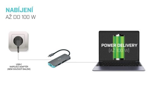 Stanice taktéž nabízí USB-C Power Delivery až 100 W, který je určen pro napájení připojeného notebooku či tabletu pomocí vašeho originálního síťového adaptéru. Dokovací stanice rovněž podporuje nabíjení připojených USB mobilních zařízení, jako jsou smartphony, čtečky e-knih, multimediální přehrávače, navigace a tablety.