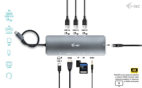 I-TEC USB-C Metal Nano Dock 4K představuje kompaktní dokovací stanicí, která výrazně rozšíří možnosti konektivity vašeho zařízení. Je vybavena konektorem USB-C, díky čemuž je kompatibilní s moderními notebooky a celou škálou nových smartphonů nebo tabletů. Přítomné porty vám umožní připojit například externí monitor, projektor nebo televizor skrze rozhraní HDMI. Rychle a jednoduše vám tak zprostředkuje obraz ve vysokém rozlišení až 4K a vaše prezentace, multimédia a další obsah budou vypadat skvěle i na větší obrazové ploše.