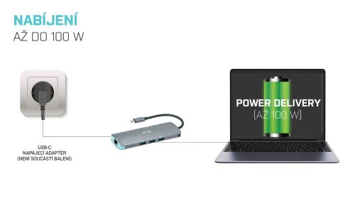 Stanice taktéž nabízí USB-C Power Delivery až 100 W, který je určen pro napájení připojeného notebooku či tabletu pomocí vašeho originálního síťového adaptéru. Dokovací stanice rovněž podporuje nabíjení připojených USB mobilních zařízení, jako jsou smartphony, čtečky e-knih, multimediální přehrávače, navigace a tablety.