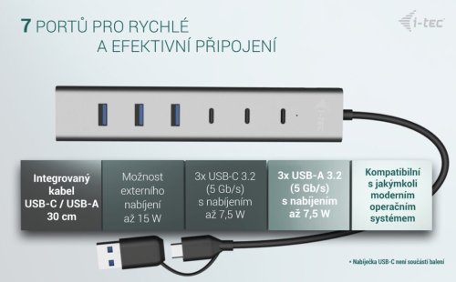 S tímto hubem získáte další tři USB-C 3.0 a čtyři USB 3.0 porty s podporou rychlého nabíjení BC 1.2 (až 7,5 W na port). Připojte si externí klávesnici a myš, přenášejte data z USB flash disku rychlostí až 5 Gbps nebo nabíjejte svá mobilní zařízení. Hub nevyžaduje instalaci ovladačů, pouze jej pomocí USB nebo USB-C konektoru připojíte a můžete jej ihned začít využívat. Vybaven je také USB-C portem pro připojení volitelného napájecího adaptéru s výkonem až 15 W (není součástí balení). Podporuje všechny běžné současné operační systémy (Windows, macOS, Linux, Android, Chrome OS, iPadOS).