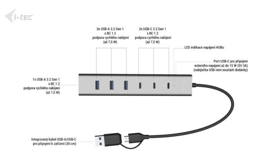 Externí USB Hub I-TEC představuje moderní řešení pro připojení nejrůznějších počítačových periferií. Dostupné konektory vám umožní provoz až 7 zařízení najednou a je ideální pro rozšíření možností vašeho notebooku, stolního počítače, a dokonce také tabletu. Pro připojení externího Hubu I-TEC totiž slouží rozhraní USB, respektive USB.