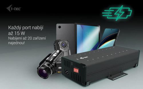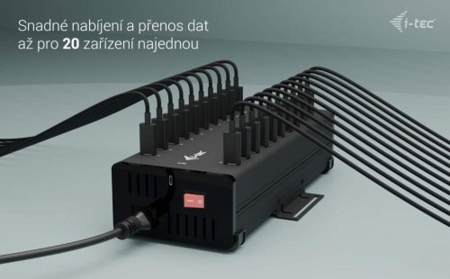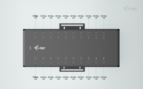 Výkonný HUB s tichým chodem vhodný pro nabíjení a přenos dat. Díky možnosti připojení skrze USB 3.0, USB-C či Thunderbolt 3/4 port je kompatibilní se všemi moderními notebooky. Má k dispozici 20 portů USB-C, z nichž každý podporuje nabíjení zařízení až 15 W a přenos dat rychlostí až 5 Gb/s (2× 5 Gbps, 18× 480 Mbps). Pokud chcete pouze nabíjet, není třeba HUB připojovat k počítači. Balení obsahuje napájecí adaptér s výkonem 360 W. Samozřejmostí je přepěťová a proudová ochrana.