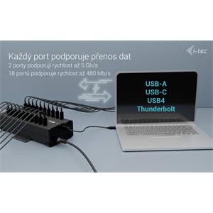 Výkonný Hub i-TEC, je určen pro napájení a přenos dat připojených zařízení. Početná nabídka konektorů vám umožní bezproblémovou konektivitu až 20 přístrojů současně. Díky přítomnosti portů USB 3.0, USB-C nebo Thunderbolt 3 a 4 je kompatibilní například s celou škálou moderních notebooků. Každý port podporuje nabíjení o výkonu až 15 W a vysokorychlostní přenos dat.