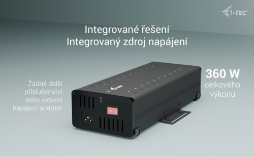Díky tomu je práce lehčí, rychlejší a s přehledem zvládnete i náročné projekty, které vyžadují činnost s velkým počtem periferií. Součástí Hubu je rovněž integrovaný napájecí adaptér o výkonu 360 W. Pro takto výkonné zařízení nesmí chybět ani ochrana proti přepětí nebo nadměrnému proudu. V plné zátěži jistě potěší také tichý chod a konstrukční důraz na dlouhou životnost a stabilní provoz.